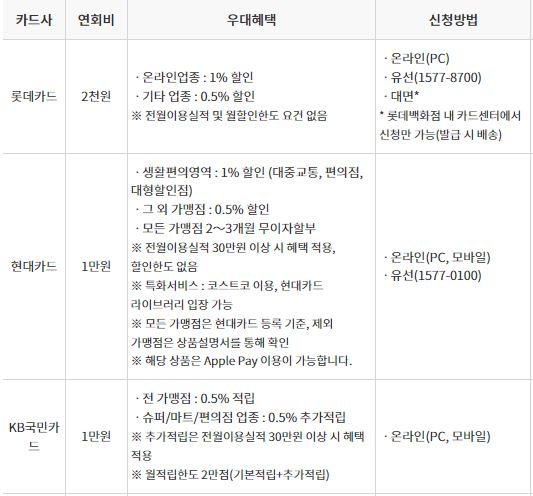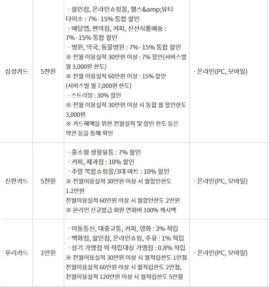 - 7개 신용카드사에서 신청 가능 (롯데, 우리, 현대, 국민, 삼성, 신한, 하나카드)